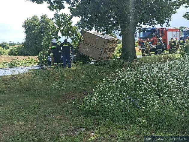 Niestety kontener spadł ze skrzyni ładunkowej i uderzył z jadący samochód osobowy opel.